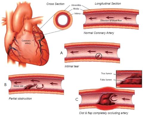 Unlike a traditional heart attack where a clot obstructs blood flow to the heart muscle, SCAD is caused by a bruising within the coronary artery or a sudden tear or shearing inside the coronary artery wall. The tear may result in blood filling the area under and around the tear or simply blocking the blood flow in the artery. A blockage such as Sally’s can be fatal without emergency care.