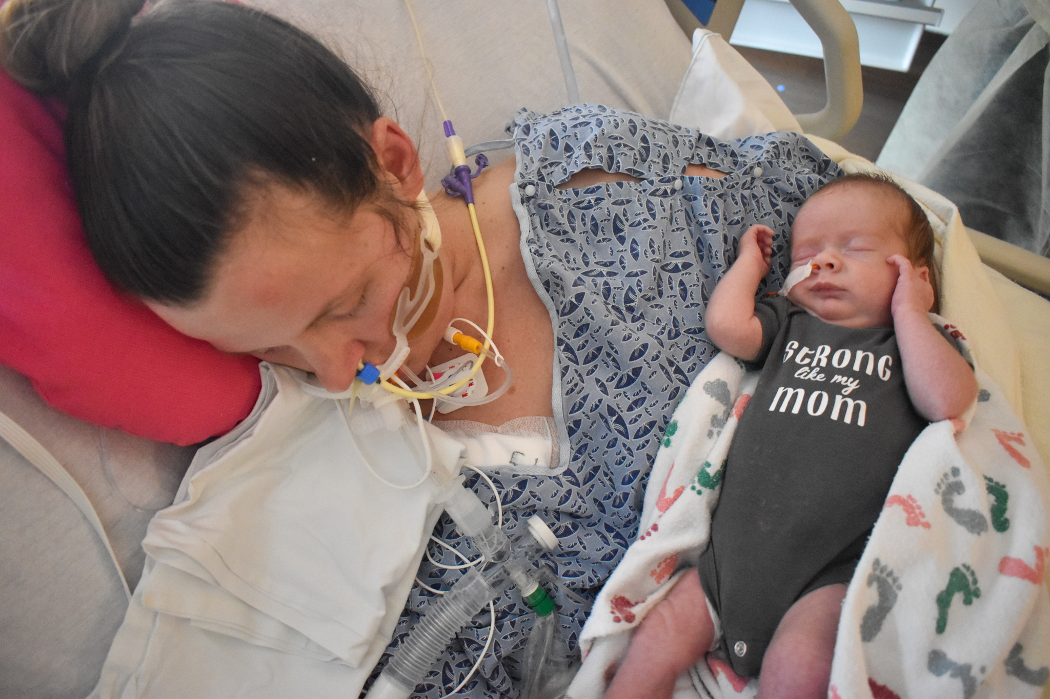 Sleeping in his mother’s arms, newborn baby Logan wears a gray onesie with four words—